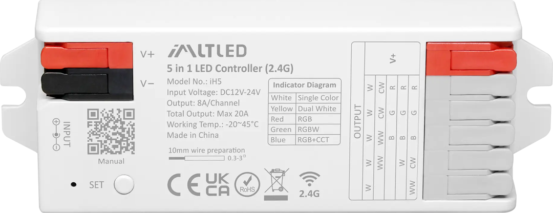 5 Output Modes for 5 LED types: Single Color, CCT, RGB, RGBW, RGB+CCT