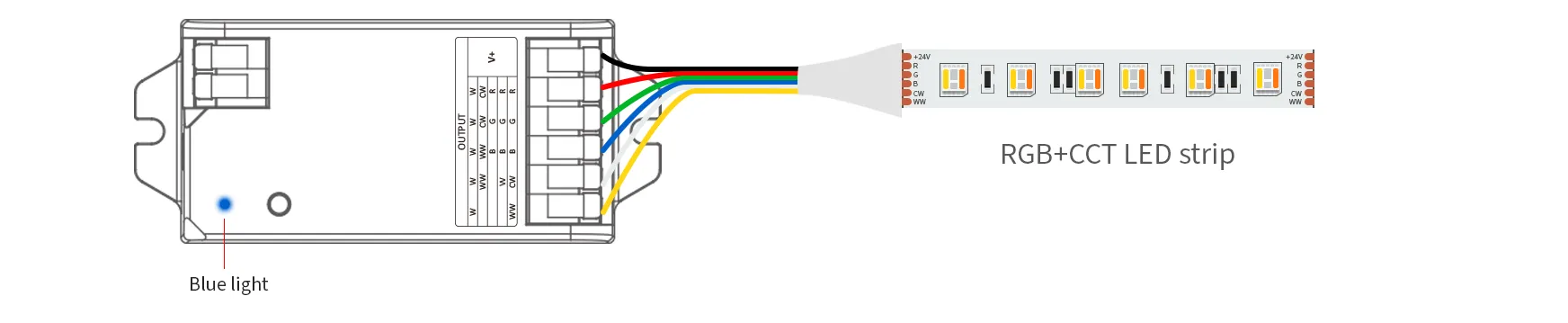 For RGB+CCT LED strip(short press “SET”–Blue indicator)