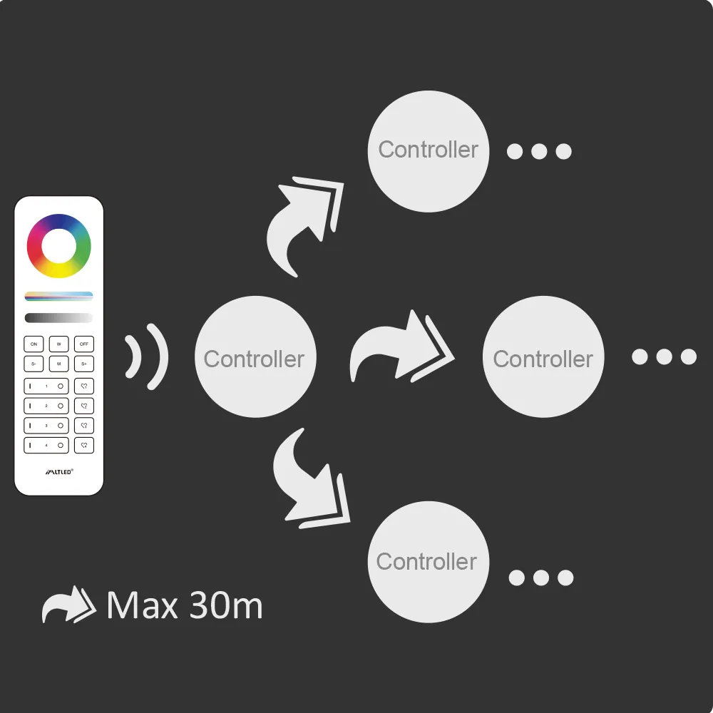 The controller can automatically forward received remote signals to other controllers within a 30 m range, enabling signal relay. The remote control range can be continuously extended.